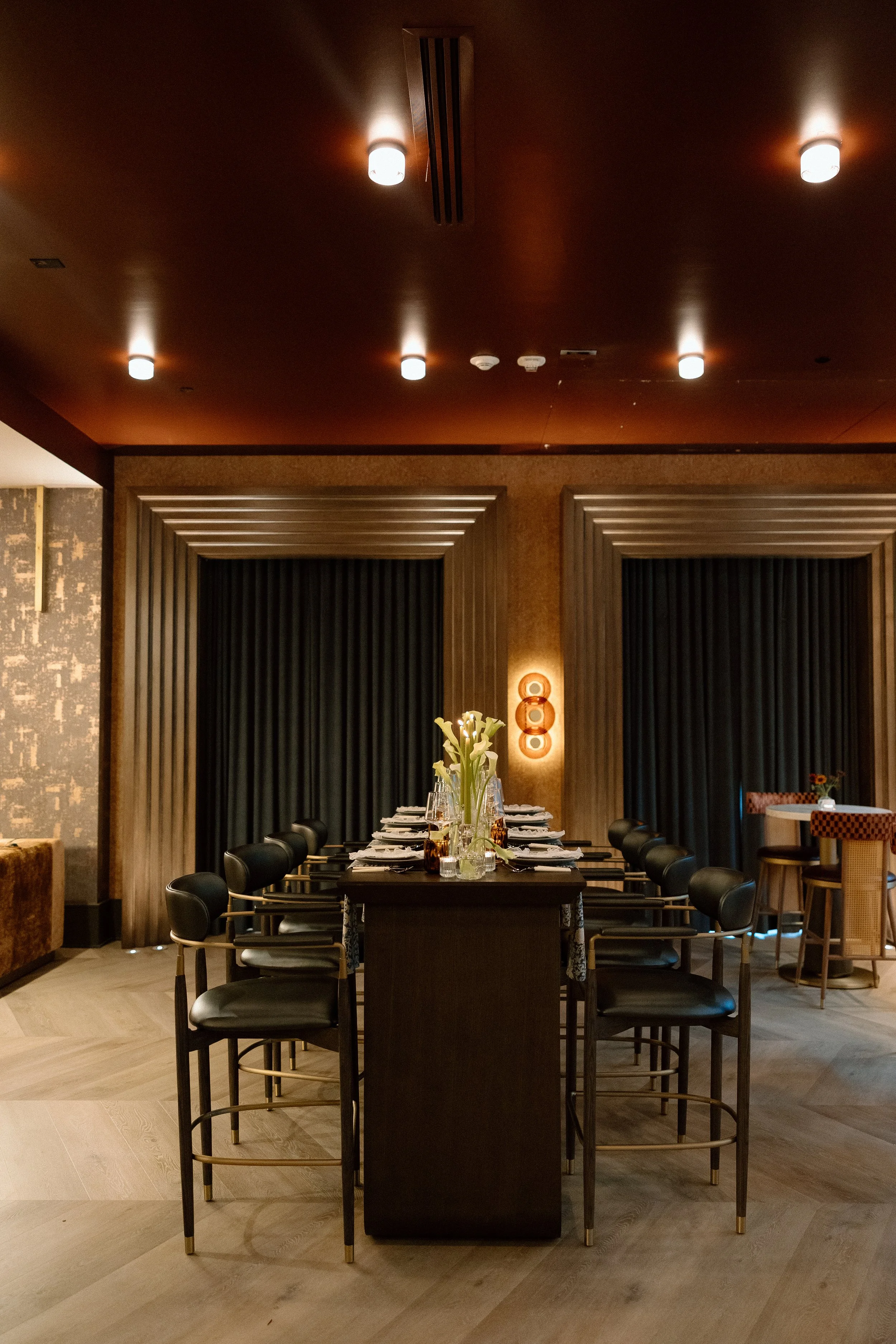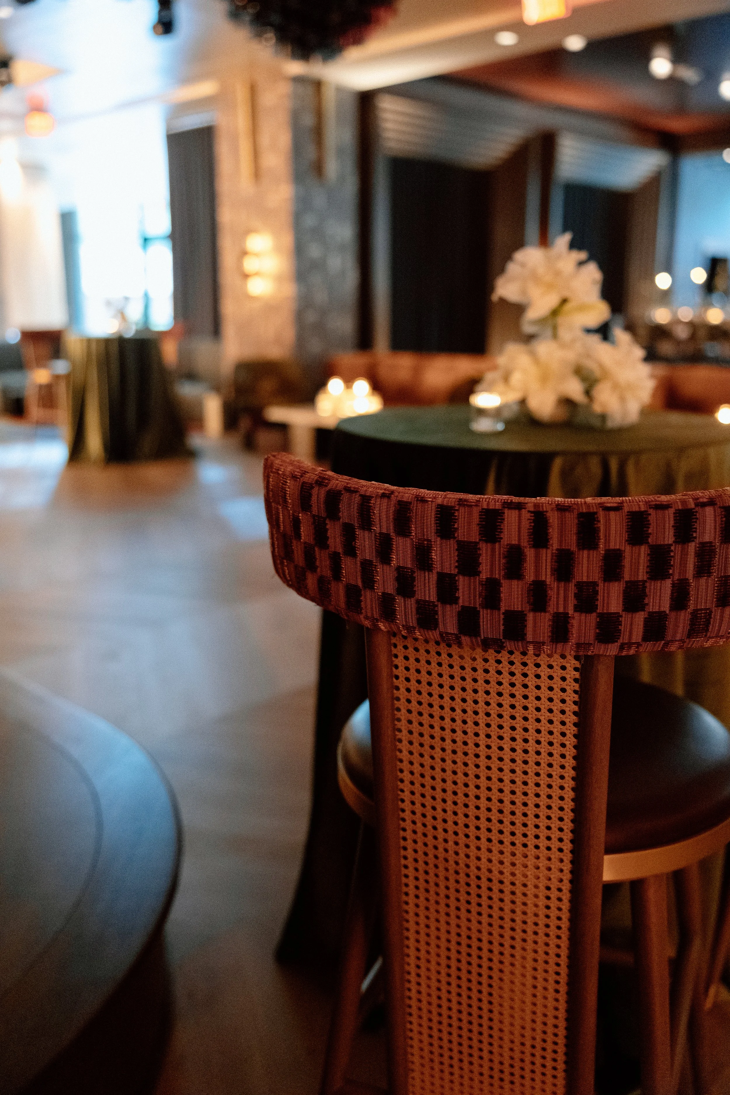 Seratonic offered no shortage of visual inspiration. Every space in the venue—from layered lounge seating to custom wall finishes—was brimming with character. Our role was to enhance the space, not compete with it, styling florals and decor that echoed the venue’s rich textures and artistic tone.