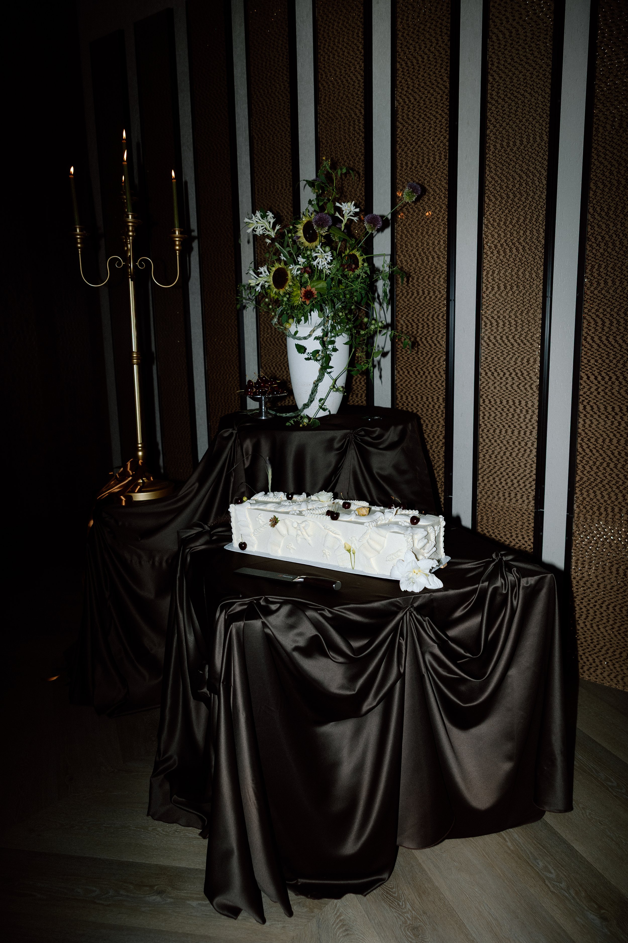 As lovers of layered textures, we embraced the current linen draping trend in a way that felt both modern and timeless. For the engraving station and cake table, we selected cool-toned dark chocolate satin linens—a neutral with depth—that allowed us to play with form, texture, and movement.