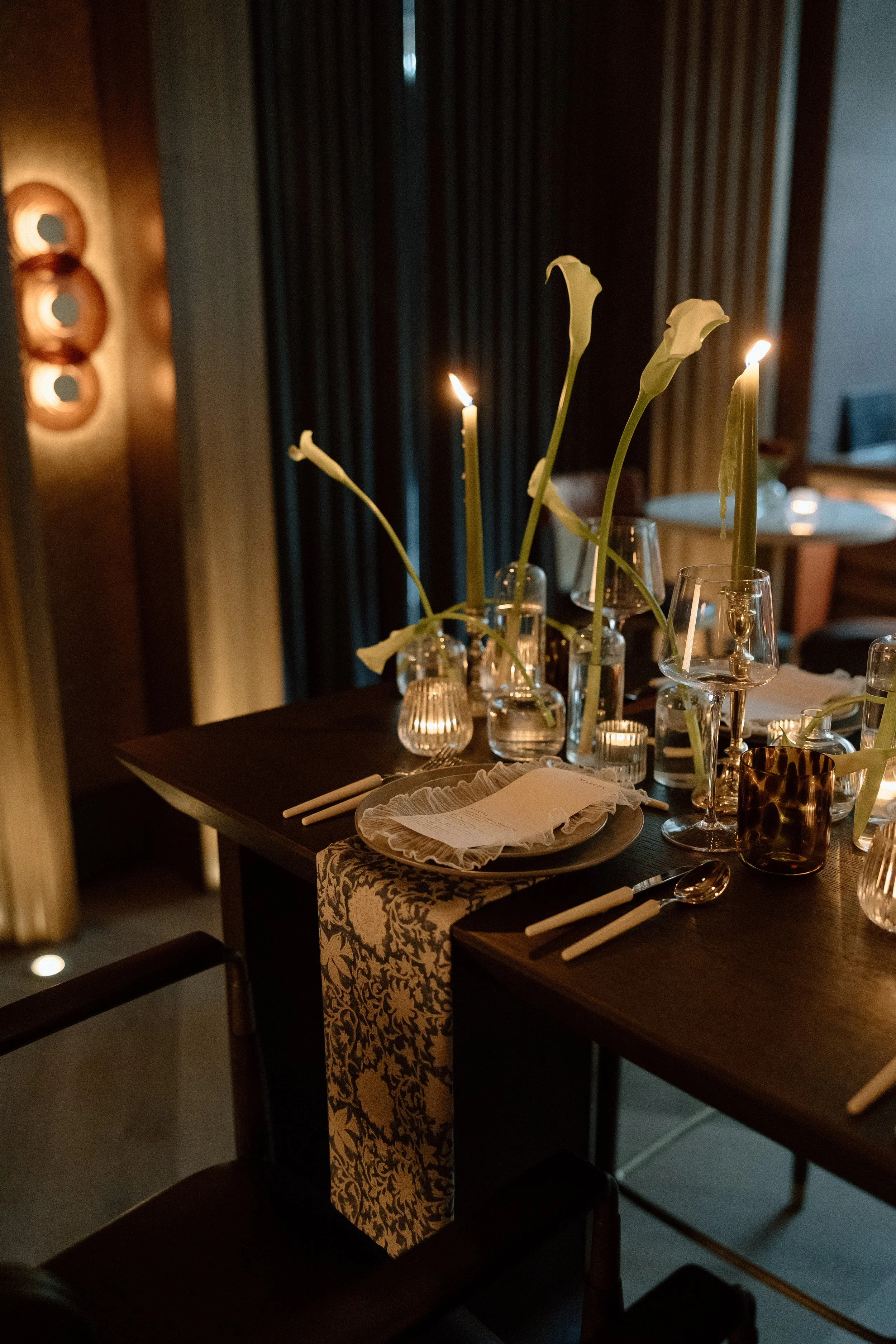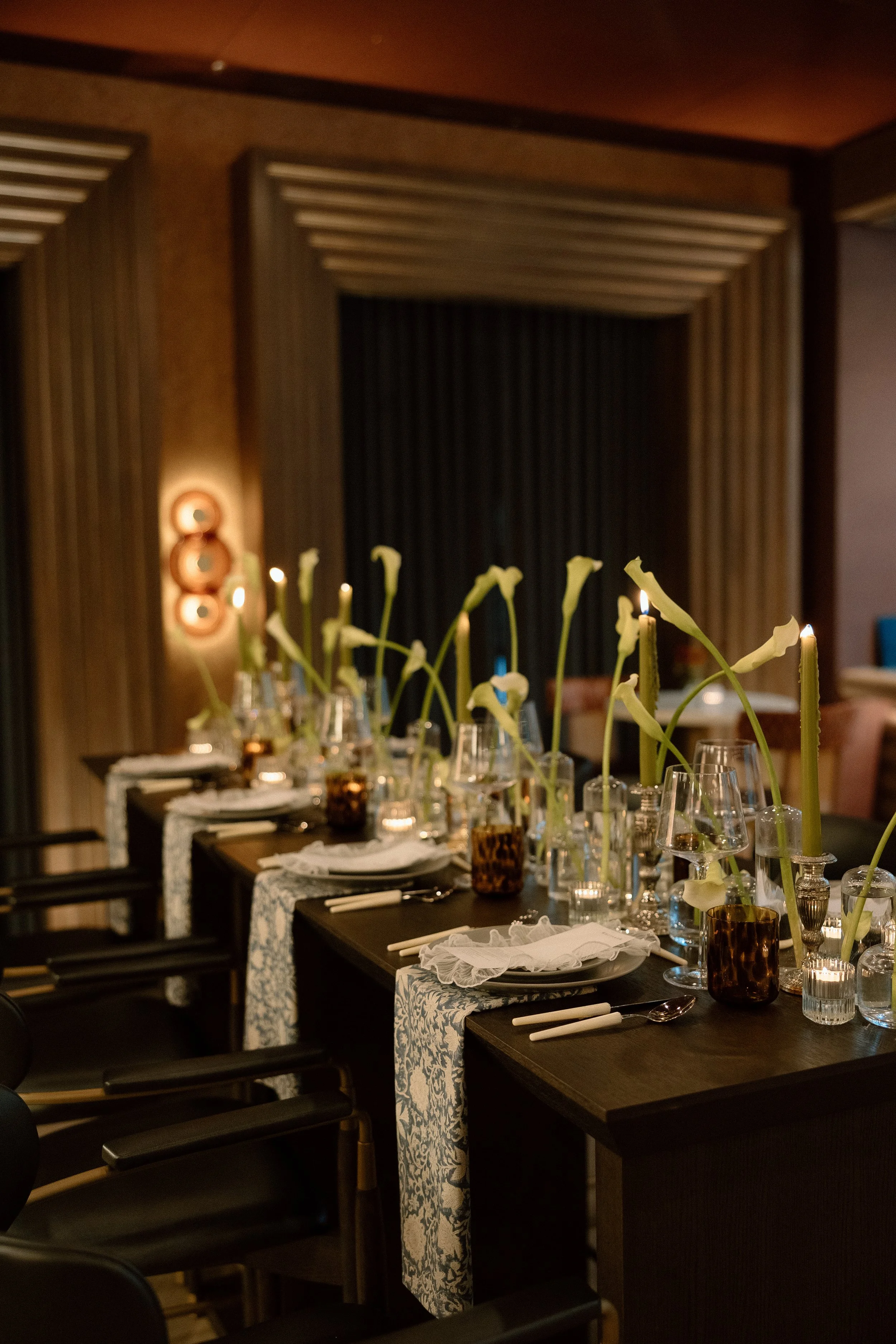 To further soften the tablescape and introduce both pattern and movement, we incorporated blue block print napkins beneath the plates, allowing them to drape off the edge of the table. This not only added a nod to the blue tones seen in the velvet curtains throughout Seratonic, but also helped ground the design with layered texture and visual interest. These details, while subtle, created a sense of thoughtful cohesion—proof that fine styling doesn’t have to shout to be felt.