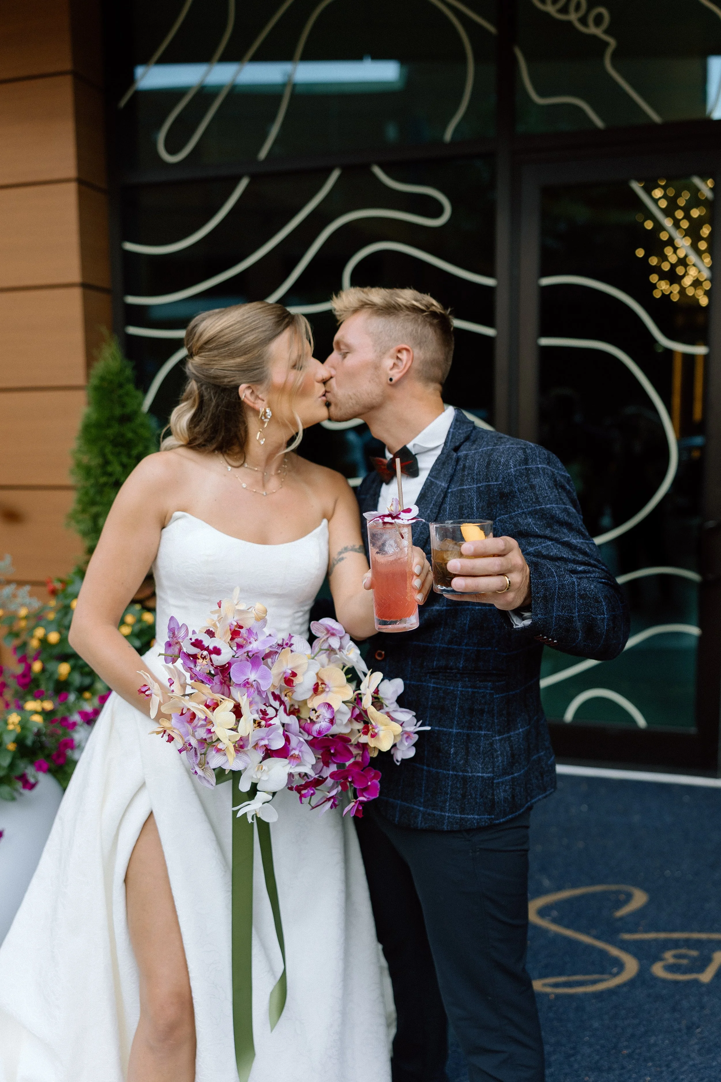 The second bridal bouquet was our take on the emerging purse bouquet trend. Crafted with a structured handle, it was designed to be carried like a handbag—fashion-forward yet floral-focused. We strung locally grown brown lisianthus, chosen for its flexibility and ability to be twisted into unique, sculptural forms. To further echo the venue’s aesthetic, we adorned the calla lilies with gold and silver chain accents, referencing the statement chain art installation in Seratonic’s entryway and the venue’s consistent use of mixed metals throughout. The result was a bouquet that felt modern, wearable, and deeply connected to the design language of the space.